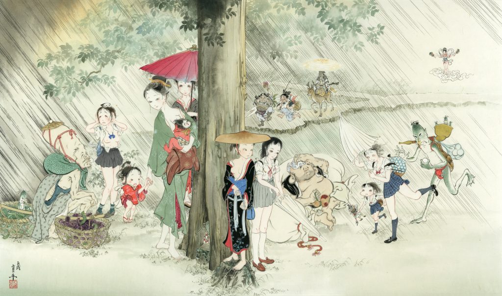 「八百万の少女 にわか雨」202561.5cm×36cm和紙に墨、アクリル、金泥
